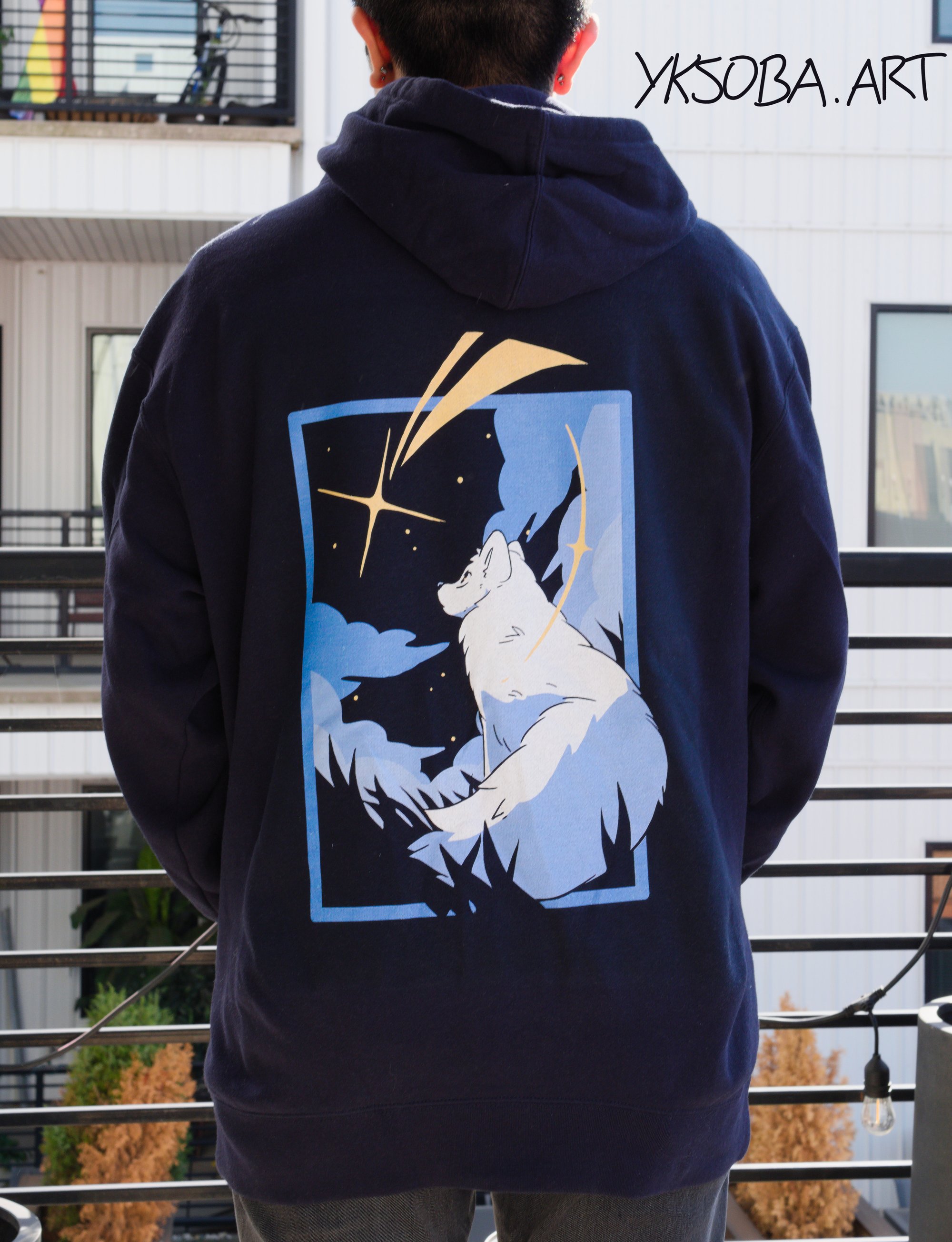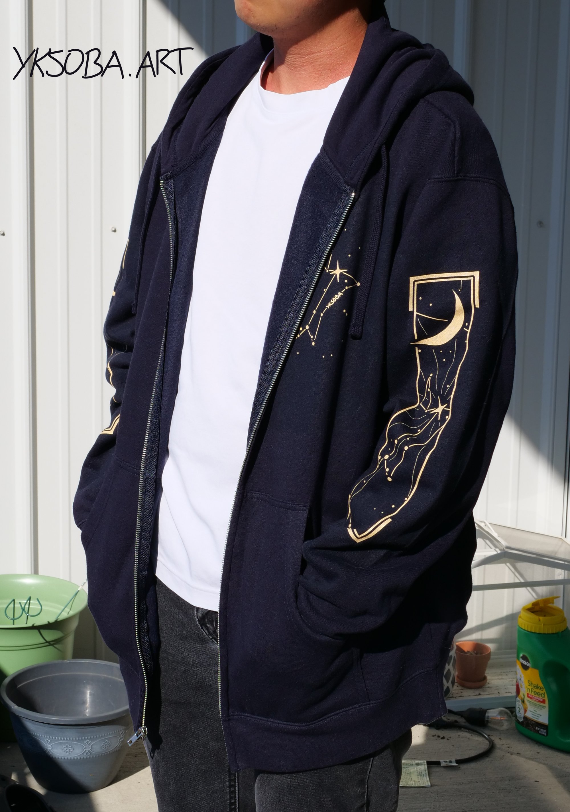 Designed by YKSOBA, screen printed on a navy blue, medium-weight, zip-up hoodie.